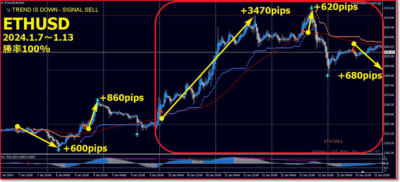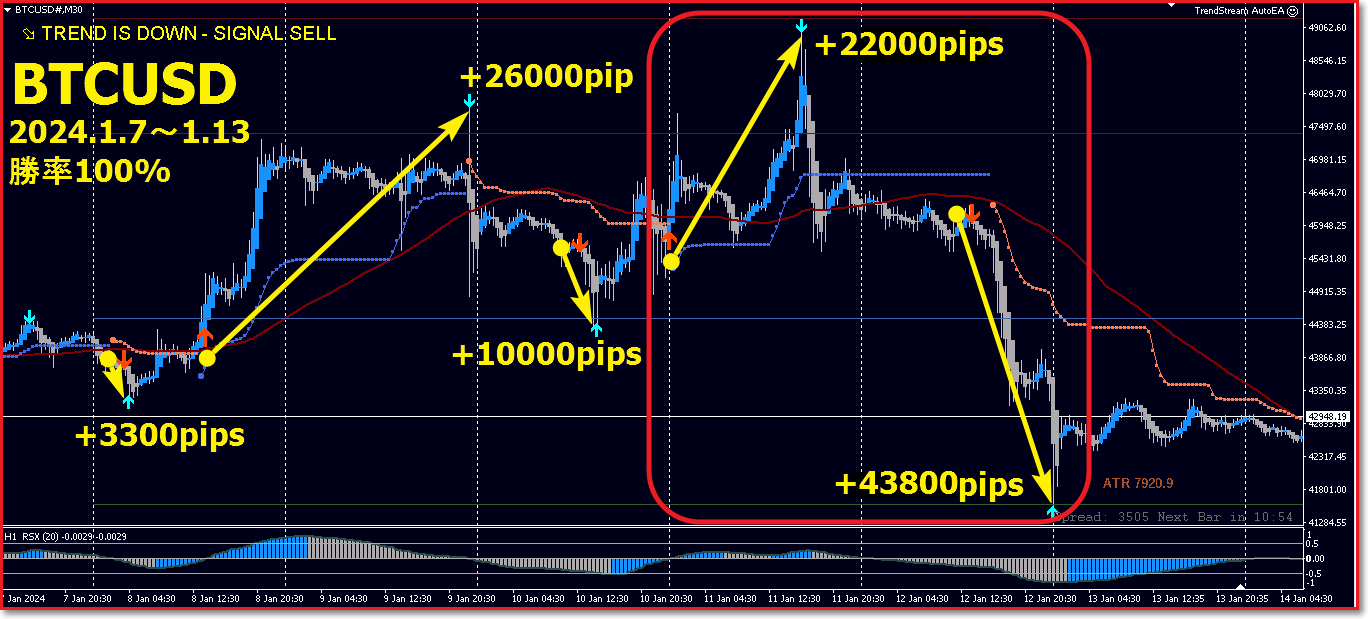 1月10日から13日にかけて、ビットコインETF承認を期待する上昇がありましたが、その上昇トレンド初動を”TrendStream”はエントリーシグナルを配信しているのが分かりますね。