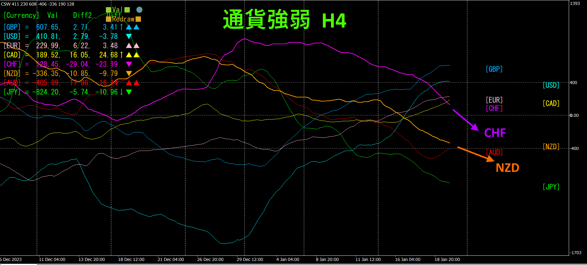 赤紫色がCHF、橙色がNZDです。CHFもNZDも下向きですが、角度ではCHFの方がNZDより急角度で下を向いています。まだNZDはCHFの下側に位置していますが、今後NZDが反転してくれば、NZDCHFは上昇することになります。