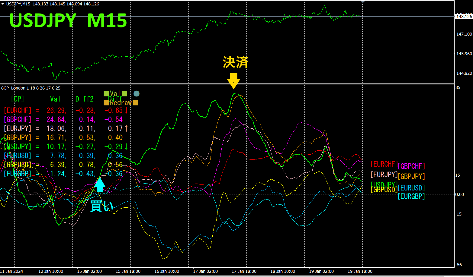 上半分は、USDJPYの15分足チャートです。下半分は、「8CP見える化インジケータ」によるものです、緑色太線のグラフがUSDJPY に相当します。