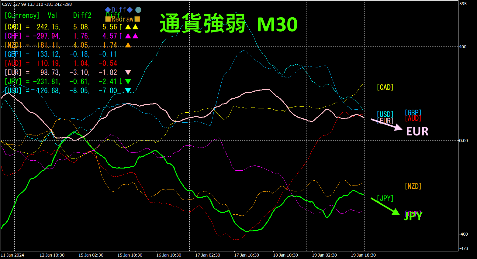 GBPJPYやEURJPYも同様な挙動をしています。通貨JPYが他の通貨に比べて相対的に弱くなっていたからです。通貨強弱チャートを下に示します。