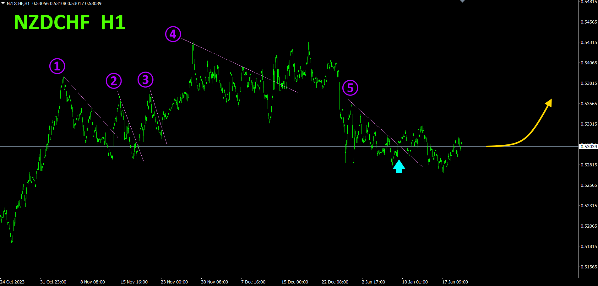 2505「天底Searchインジケータ」を使い、大底に位置する通貨ペアとしてNZDCHFを選択しました。大底からの上昇を狙っています。