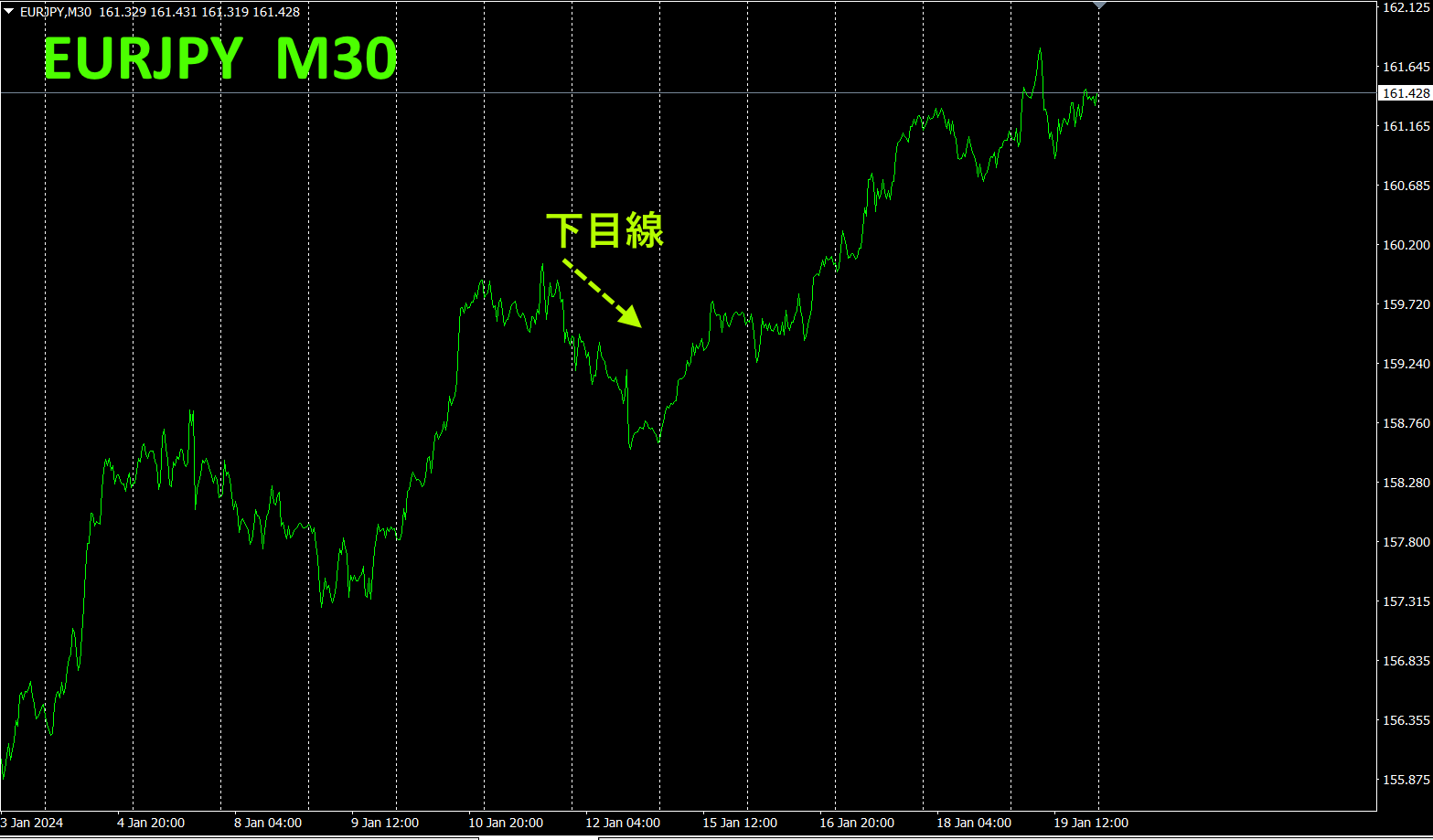 ピンク色がEUR、緑色がJPYです。JPYもEURも下向きですが、JPYの傾きの方が急なので、結果としてEURJPYはやや上昇することになります。