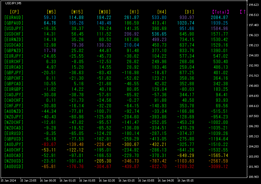 Total数値の降順に並び替えています。最も下の行にあるAUDUSDは、全ての時間足で赤色系の表示色になっていて、Total数値が-3009.12と大きなマイナスの数字になっています。AUDUSDに下降トレンドが発生していることを示しています。