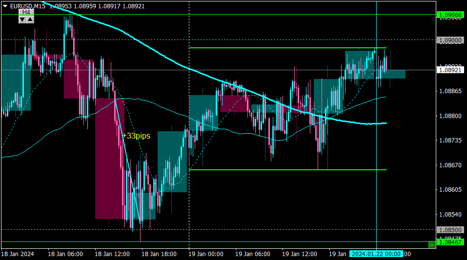 〇前日のトレード・USDJPY ドル円(15分足)昨日は先週安値141.50付近での値動きにとどまったためノートレード。・EURUSD ユーロドル(15分足)昨日は1.090付近でのプライスアクション