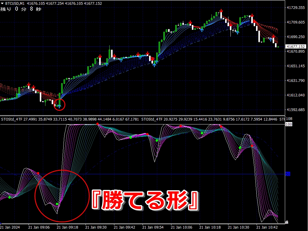 ② 矢印サイン点灯状態で、インジケーターのピンク色の帯が、緑の帯を下からすくい上げるような形状であれば、現在のローソク足が確定する数秒前か確定の直後に1分判定または3分判定でハイエントリーします。
