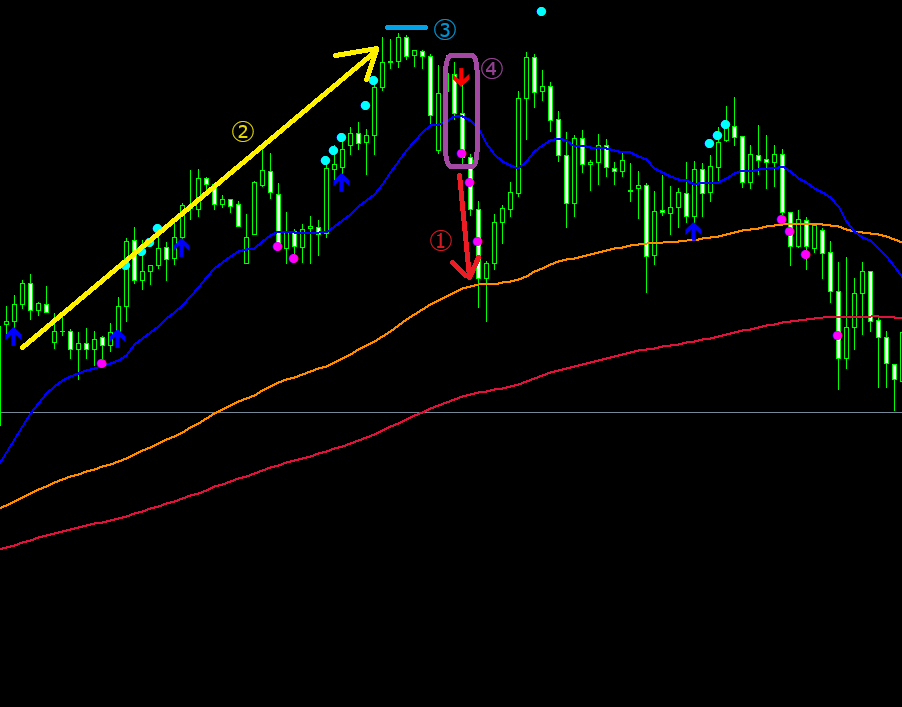 ④ショートを狙う場合が赤矢印にピンクの●(ロングは青矢印に水色の●)