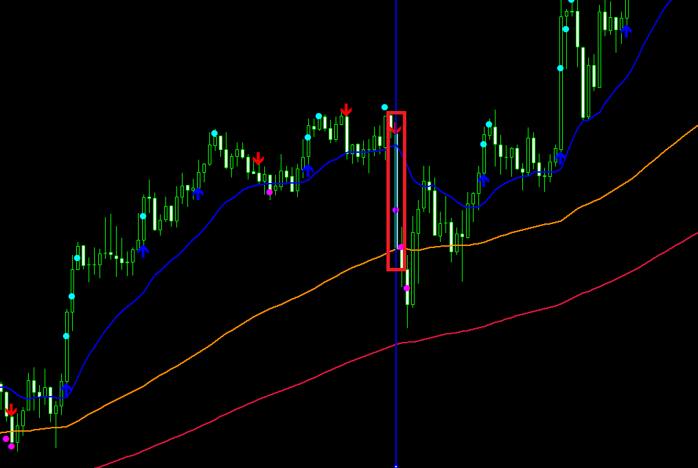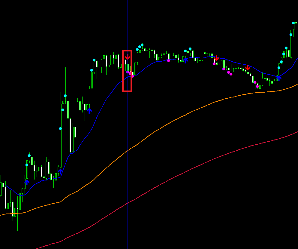 赤矢印+ピンク●が同時発生した足で終値がEMA20を下回っています。