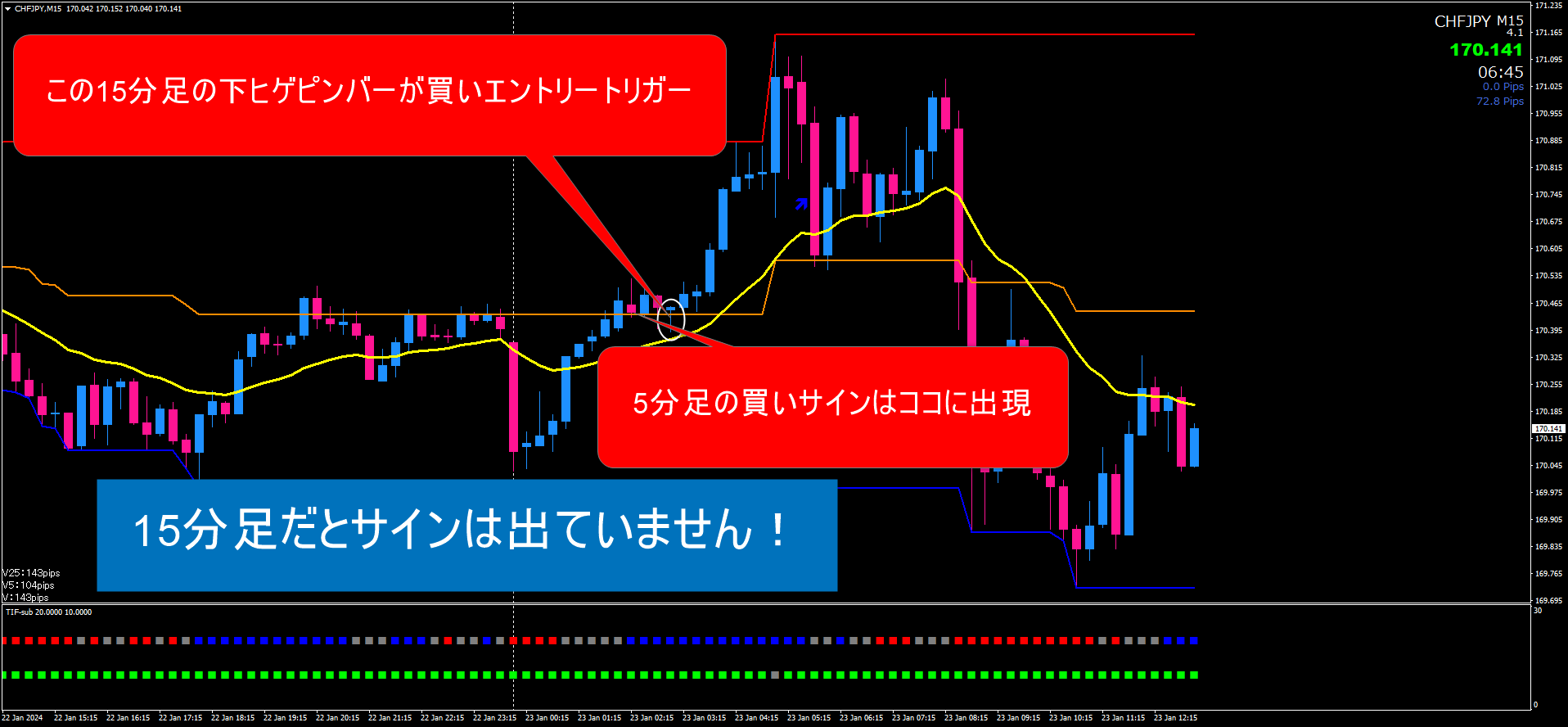 15分足で21EMAが上向き付近での下ヒゲピンバーが出現!