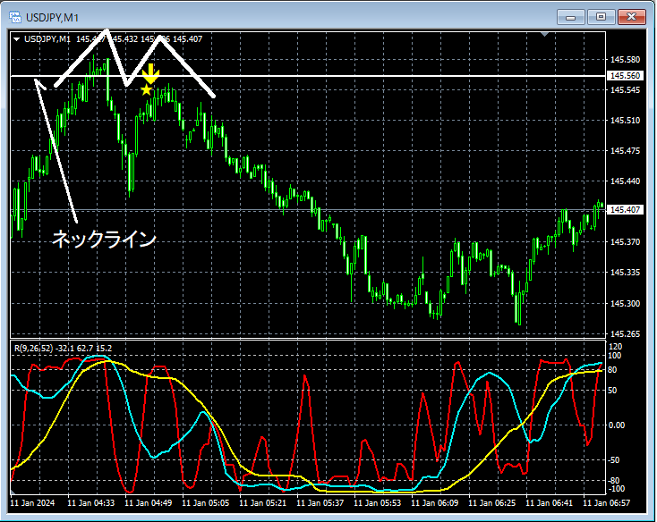 上の1分足を見てみると、15分足のダブルトップのネックライン付近でダブルトップを形成していることが分かる。そのダブルトップの右側の山ではmBDSR(RCI2本フィルター)の戻り売りサインが点灯し、その後、プライスは大きく下げている。