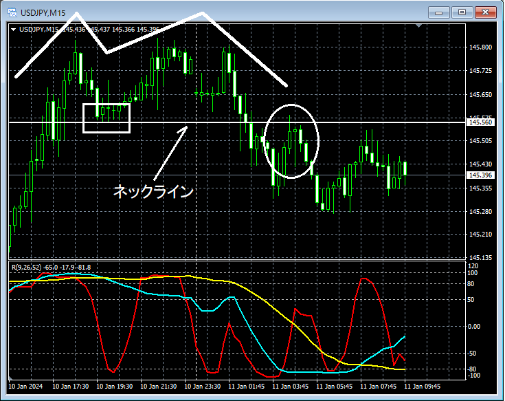 上位足のダブルトップのネックラインと下位足のダブルトップとmBDSR(RCI2本フィルター)の戻り売りサイン
