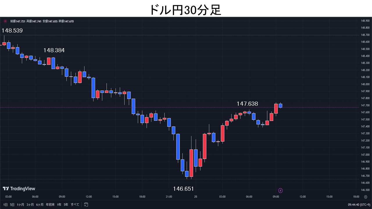東京時間、ドル円は、本邦長期金利の上昇を受け、日米金利差縮小を意識した売りが先行。日経平均の下落なども受けドル円は、一時147.76円まで下落。欧州時間、日経平均先物の下落や米10年債利回りの低下を受け、ドル円は147円を割り込み146.65円まで下落。NY時間、ドル円は売り一巡後買い戻しが先行。1月米製造業・サービス部門PMI速報値が予想を上回ると、米10年債利回りが上昇し、ドル円は147.63円まで買い戻された。