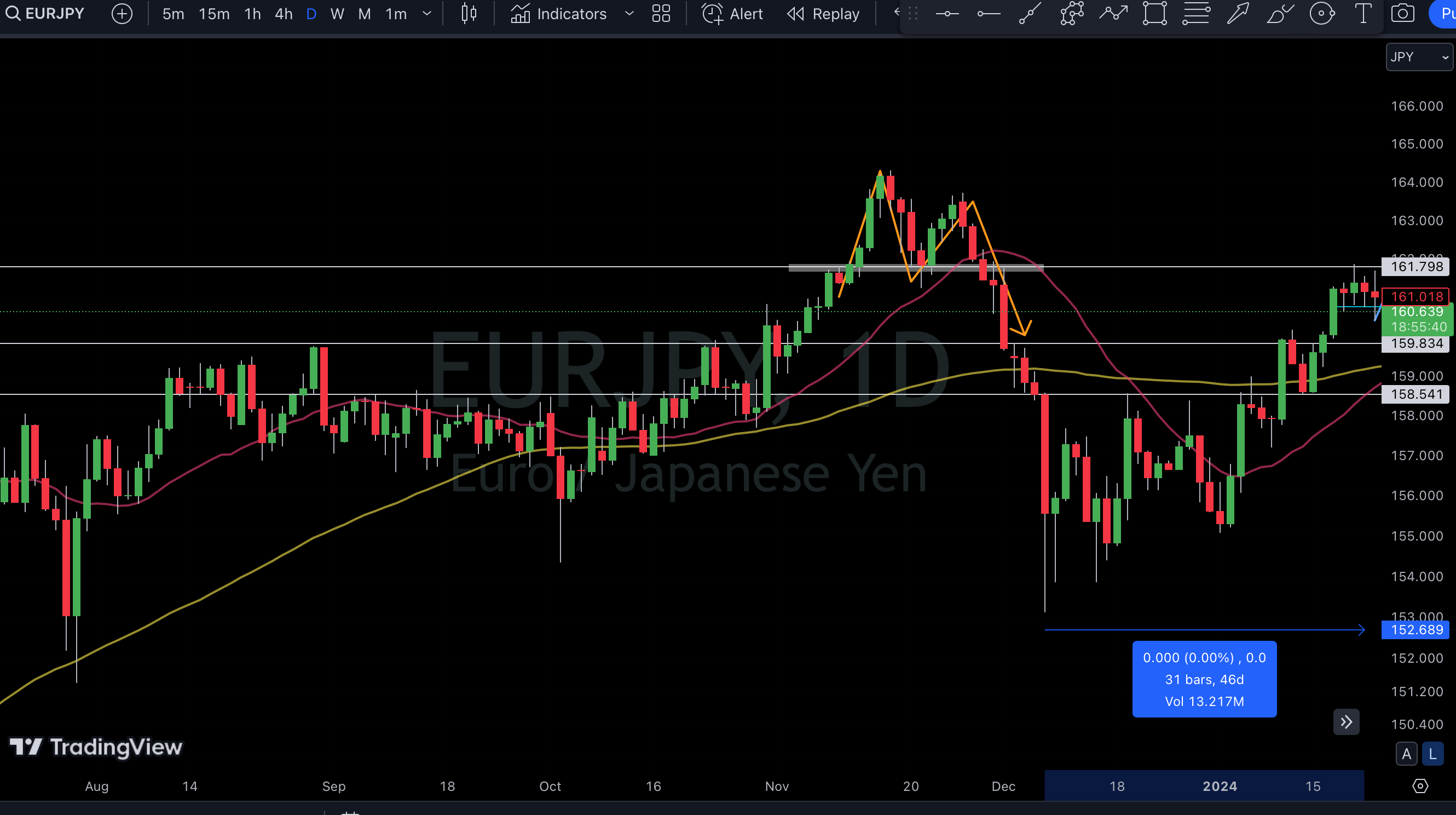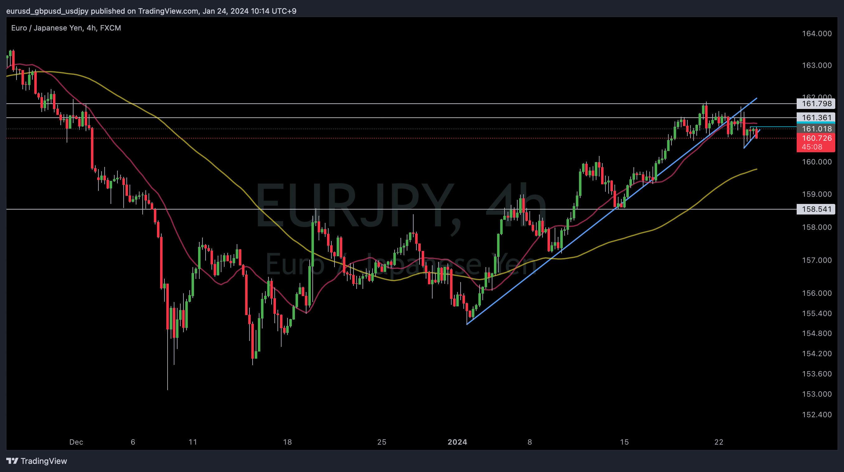 4時間足、上値攻防で時間も経過したので、青の安値切り上げラインを下抜けてきて、戻り抑えられてくるか