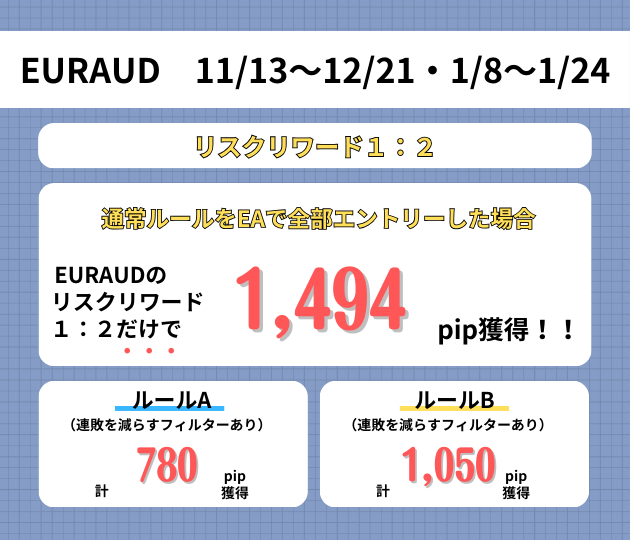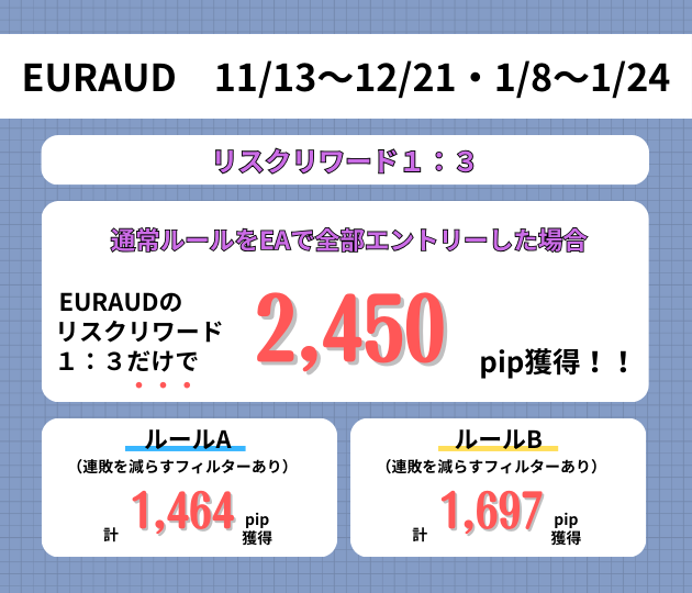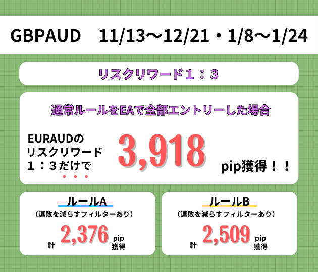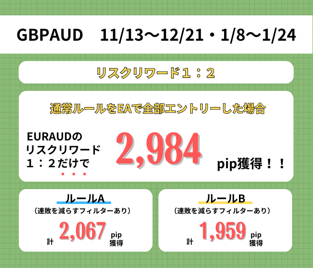 EURAUD,GBPAUDともに負け越しですが、連敗を減らすフィルターを使用するとかなり負けが減ることから、相場的にもレンジのところが多かった印象です。