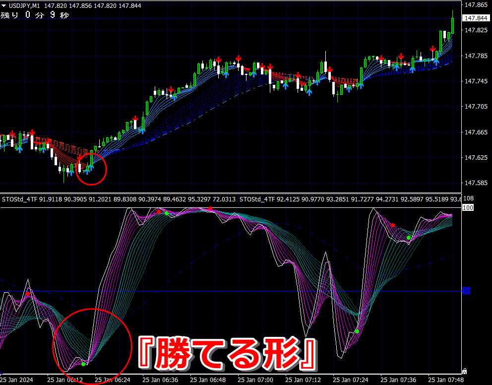 ② 矢印サイン点灯状態で、インジケーターのピンク色の帯が、緑の帯を下からすくい上げるような形状であれば、現在のローソク足が確定する数秒前か確定の直後に1分判定または3分判定でハイエントリーします。