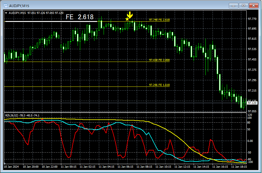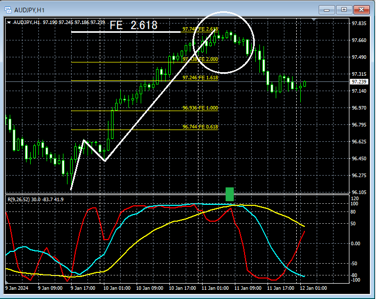 上の1時間足でフィボナッチエクスパンションをあててみると、白い円で囲ったあたりでは、フィボナッチエクスパンション2.618付近の節目まで上昇していることが分かる。また、RCI3本ラインを見てみると、いわゆるRCI3重天井の形(緑色の四角のあたり)まで上昇しており、下位足で戻り売りを考えてもおかしくない場面かもしれない。