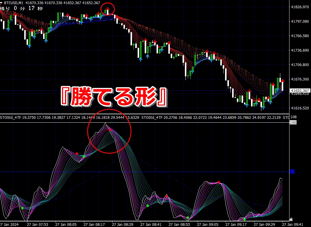 ② 矢印サイン点灯状態で、インジケーターのピンク色の帯が、緑の帯を下からすくい上げるような形状であれば、現在のローソク足が確定する数秒前か確定の直後に1分判定または3分判定でハイエントリーします。