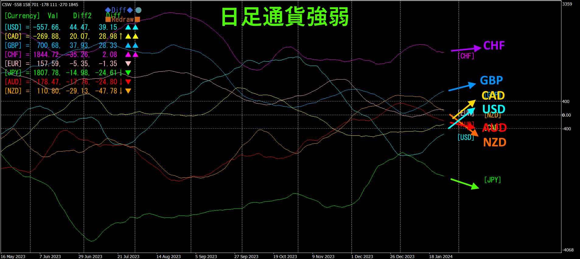 USD、CAD、GBP、CHFが上向きです。一方、NZD、AUD、JPYは下向きになっています。一旦は強まったJPYですが、日足チャートで円安方向に向かっています。