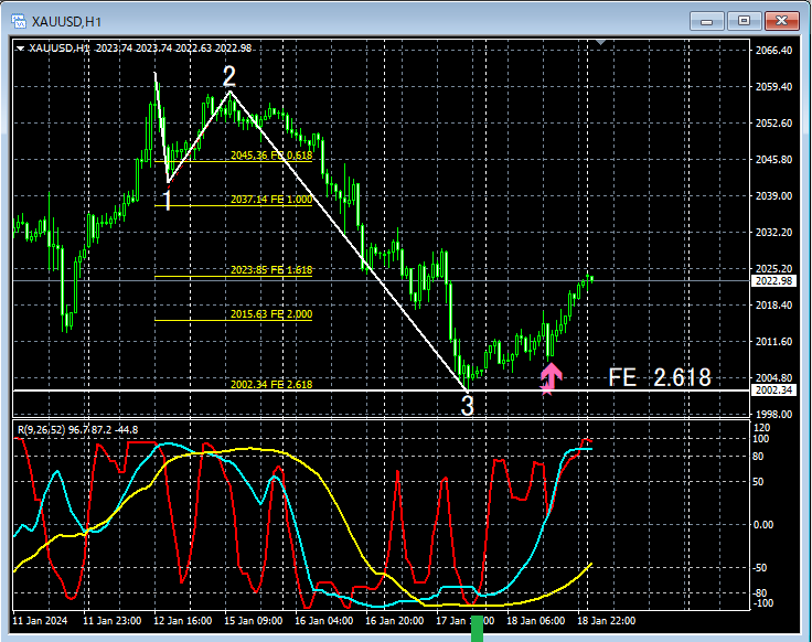 上の1時間足を見てみると、フィボナッチエクスパンション2.618まで下げており、エリオット波動下降第3波が終了し調整第4波に入るかもしれないという場面である。また、RCI3本ラインを見てみるといわゆるRCI3重底(緑色の四角)まで下げており、いったん上昇する可能性を考えてもおかしくない場面かもしれない。チャートの推移を見守ると、mBDSR(フィルター:RCI26とRCI52)の押し目買いサインが点灯し、その後、プライスは順調に上昇している。