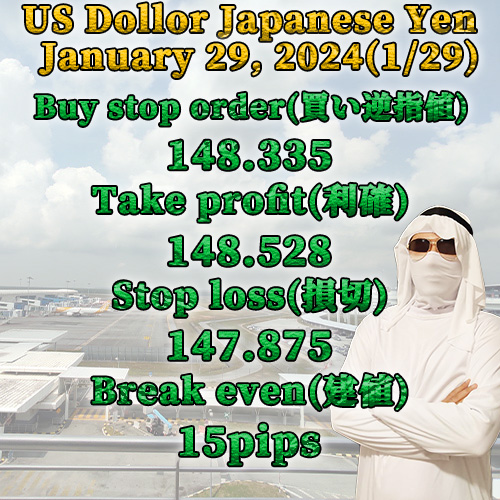 【八条流FX完全無裁量脳死トレード手法】の2024/01/29のUSDJPY(ドル円)の先出し相場予想です。