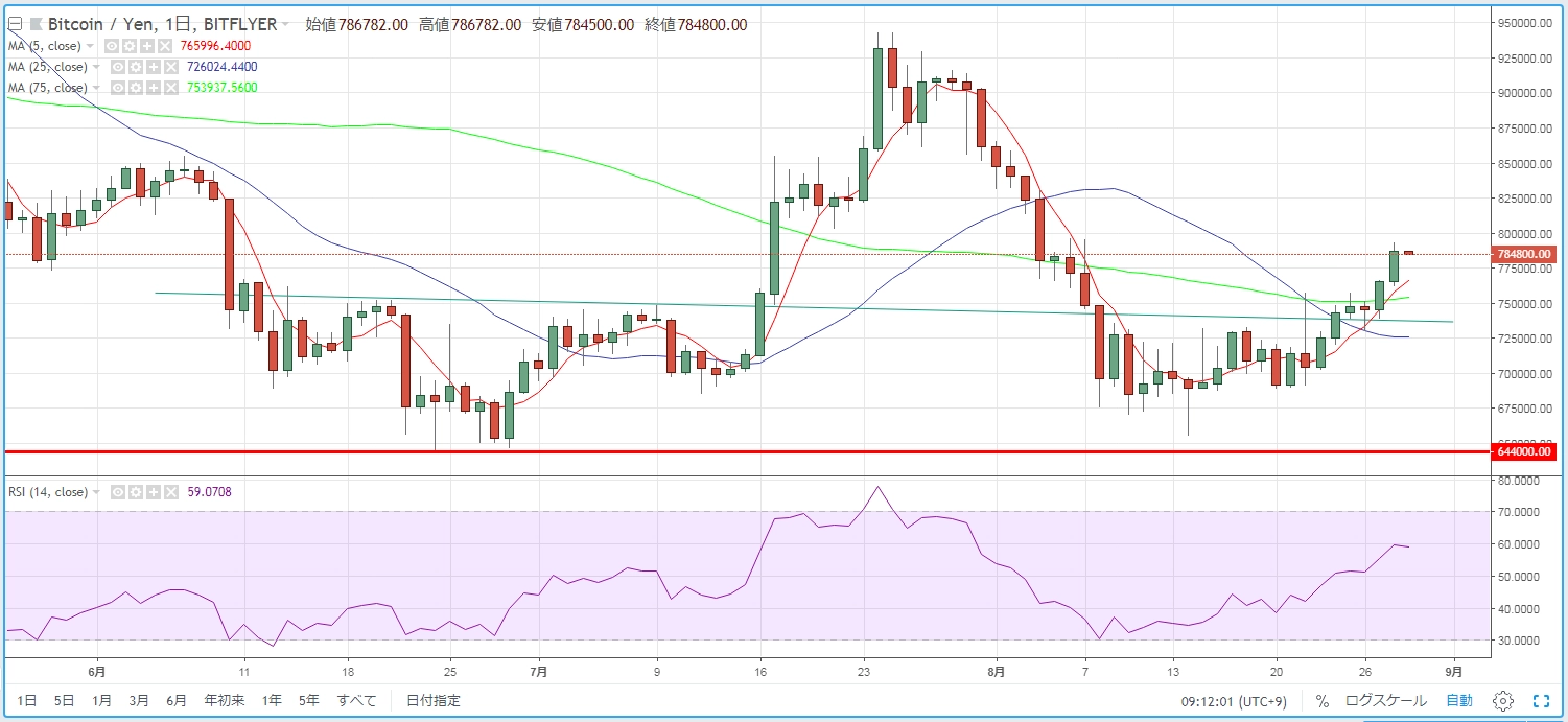 画像は2018年8月30日のキャプチャ。「濃緑」が見られた昨日から、返す刀で「赤」となった本日。とはいえ、上昇の調整とも考えることもできます。明日の色が重要です。