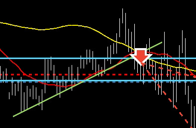 1時間足、小反発後の安値切り上げラインを下抜けでmaにも抑えられた形
