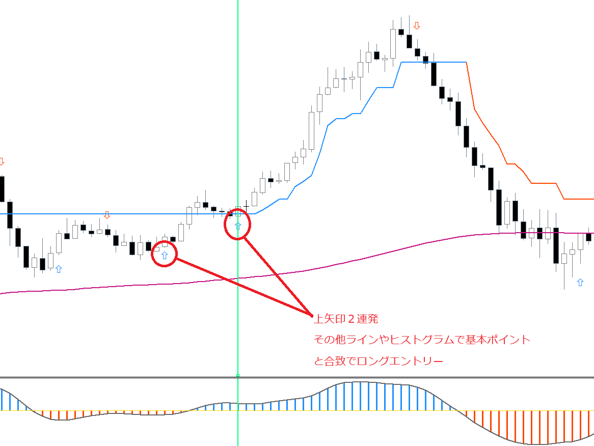 同じ方向のシグナルが2連続でた場合にその方向にエントリーです。