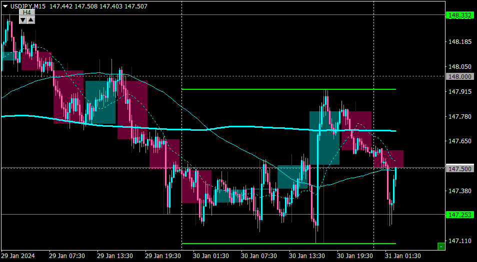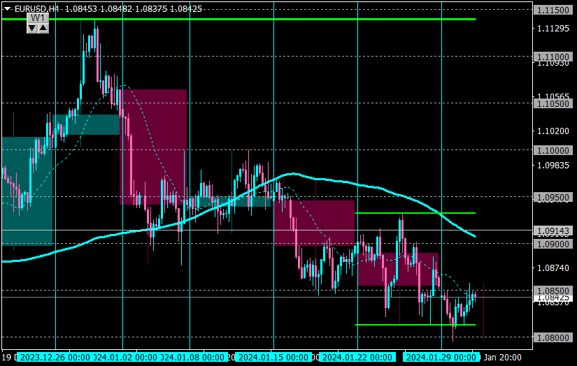 昨日は上昇しかけたものの、1.0850付近にあるH4MA(期間21)が抵抗となり上げ止まっている。