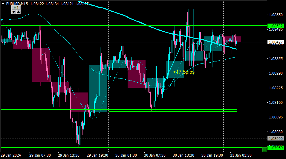 1.0850を上抜けることを期待したが、上げ止まってしまったのでイグジット。+17.5pips
