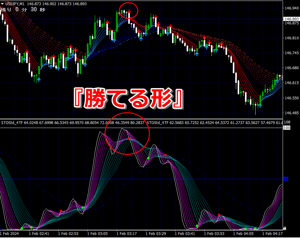 ② 矢印サイン点灯状態で、インジケーターのピンク色の帯が、緑の帯を下からすくい上げるような形状であれば、現在のローソク足が確定する数秒前か確定の直後に1分判定または3分判定でハイエントリーします。
