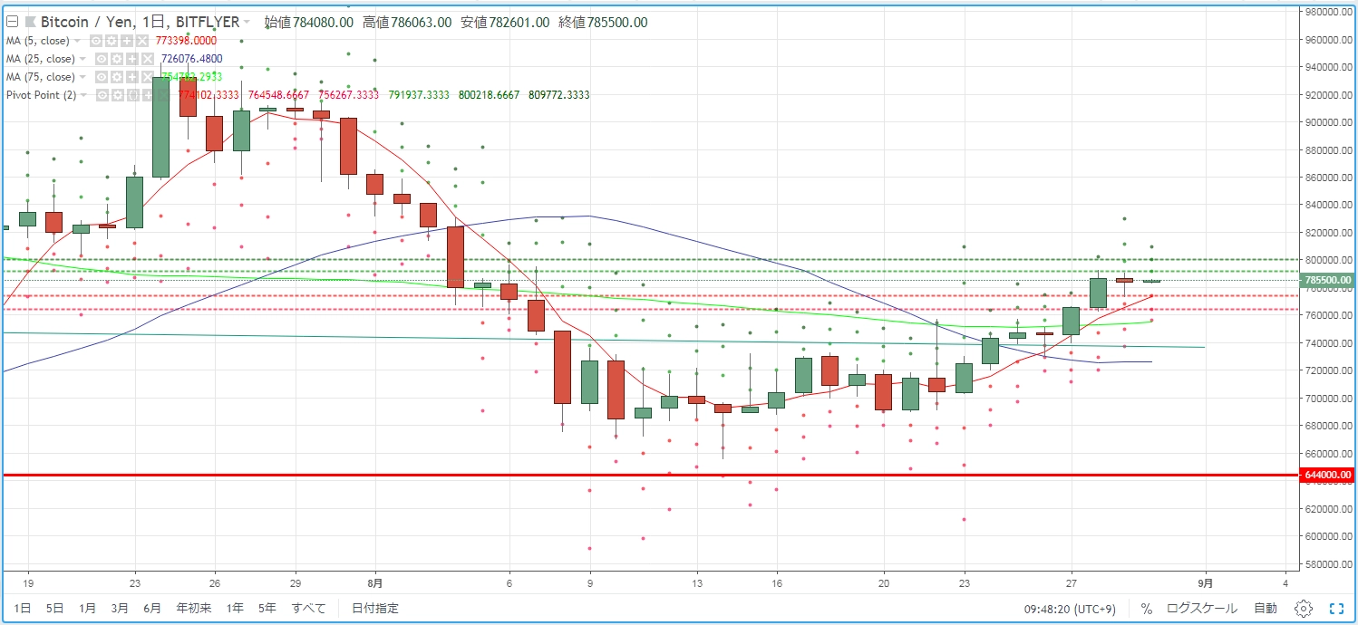 画像は2018年8月31日のキャプチャ。「濃緑」から「赤」となり、そして今日は「赤」の割合が大きくなっています。最近の上昇に対する戻りか、下げの本流なのか、注目です。