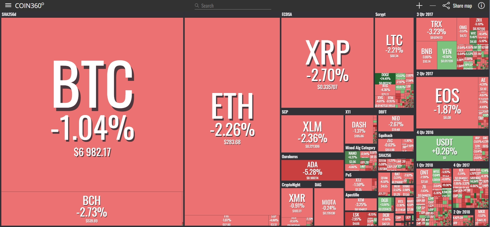 coinmarketcap(コインマーケットキャップ)のサイトから、ドミナンス(各銘柄が仮想通貨全体の時価総額に占めるパーセンテージ)を定点観測していきます。仮想通貨全般が下方向に大きく動き出している相場状況を受け、毎日更新することとし、仮想通貨業界を俯瞰および転換期を早期に発見することを目的とします。