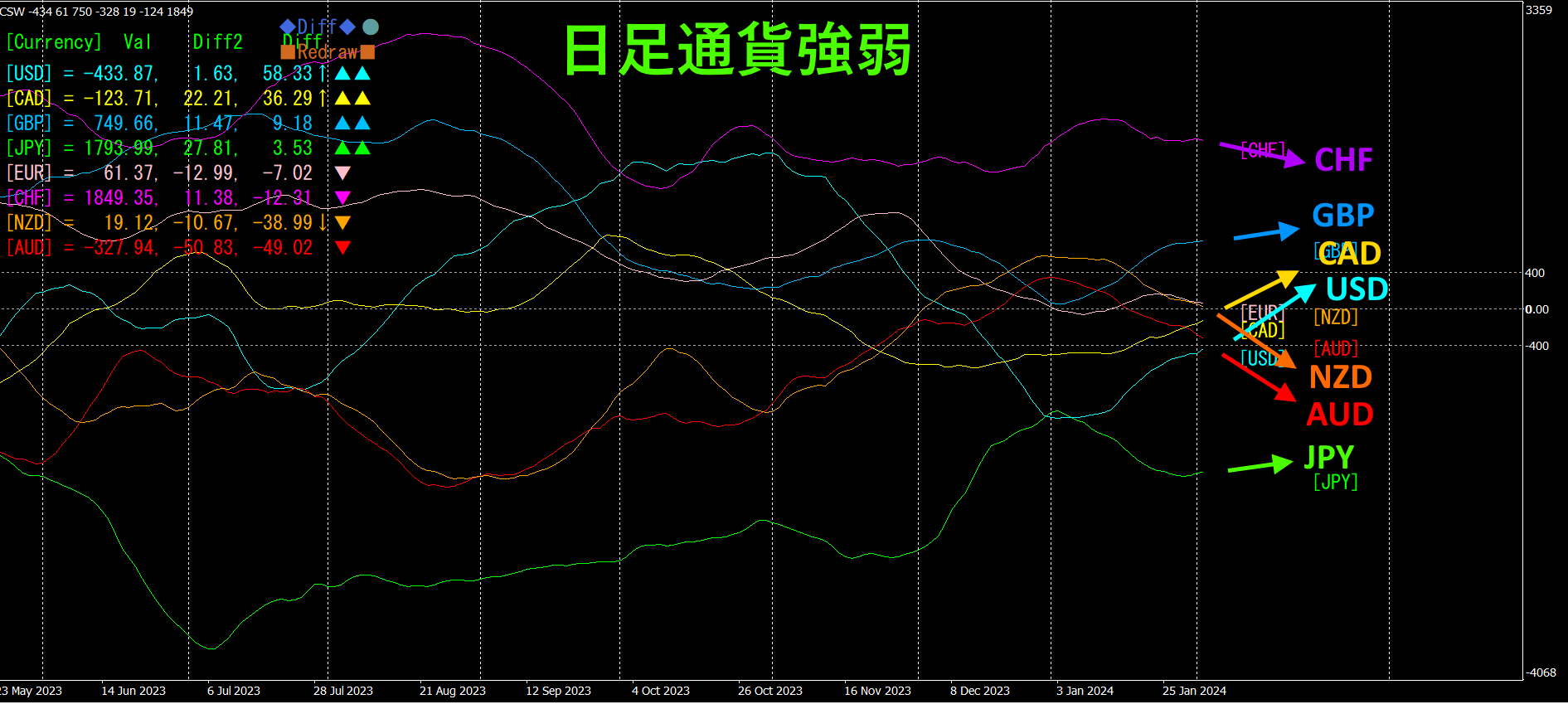 USD、CAD、GBP、JPYが上向きです。一方、AUD、NZDは下向きになっています。日足チャートでは、USDが突出して強くなっています。