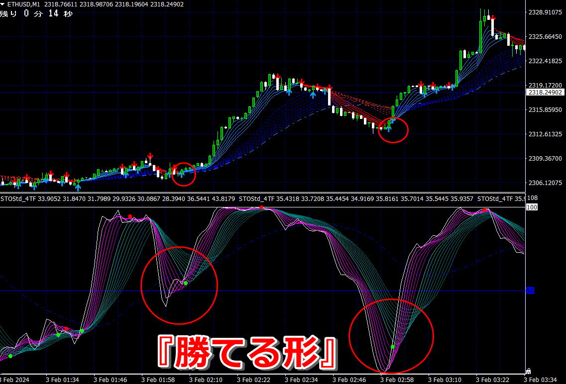 ② 矢印サイン点灯状態で、インジケーターのピンク色の帯が、緑の帯を下からすくい上げるような形状であれば、現在のローソク足が確定する数秒前か確定の直後に1分判定または3分判定でハイエントリーします。