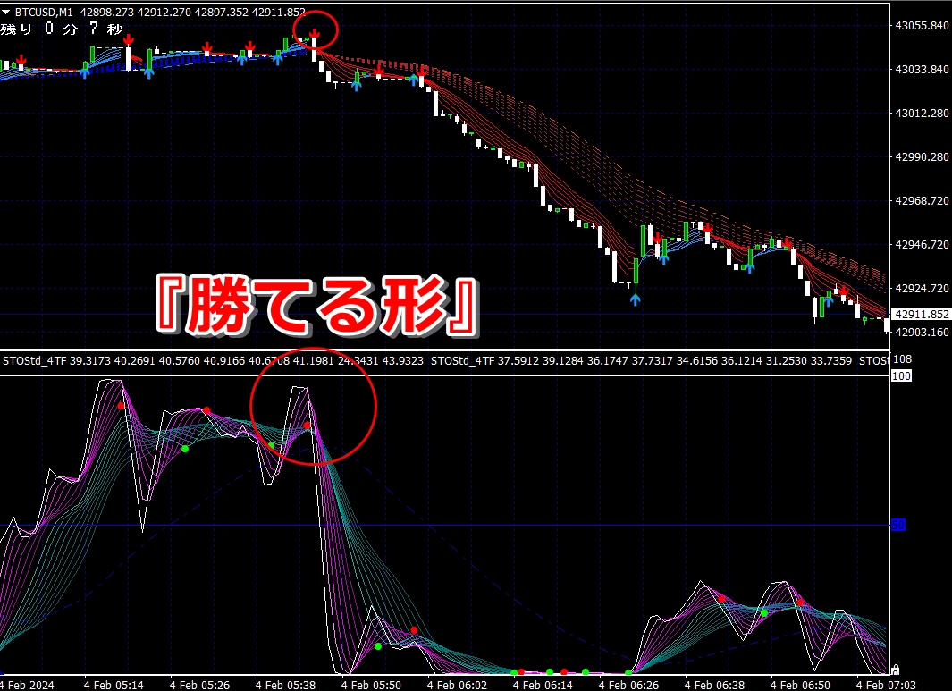 ② 矢印サイン点灯状態で、インジケーターのピンク色の帯が、緑の帯に上から覆いかぶさるような形状であれば、現在のローソク足が確定する数秒前か確定の直後に1分判定または3分判定でローエントリーします。