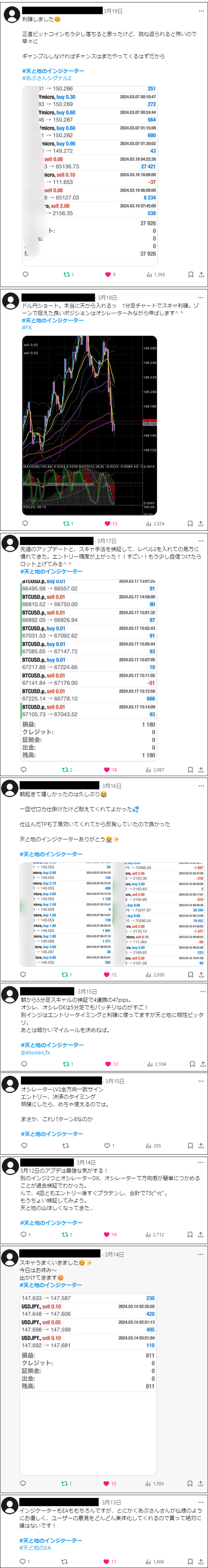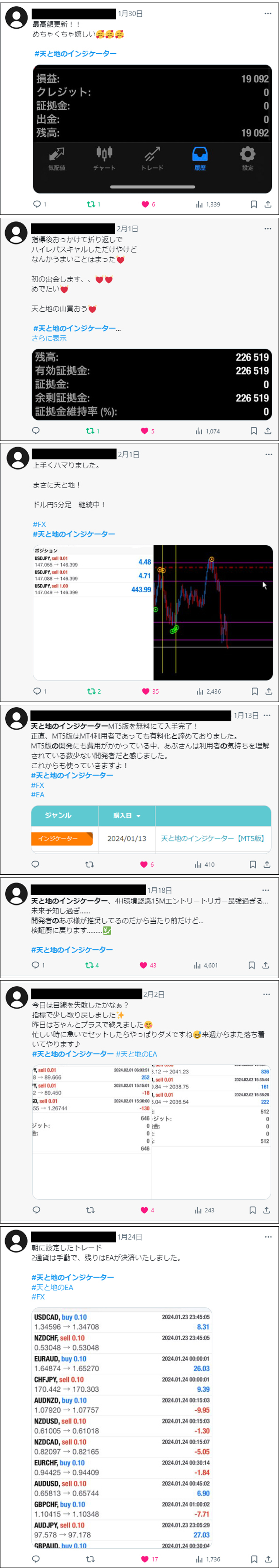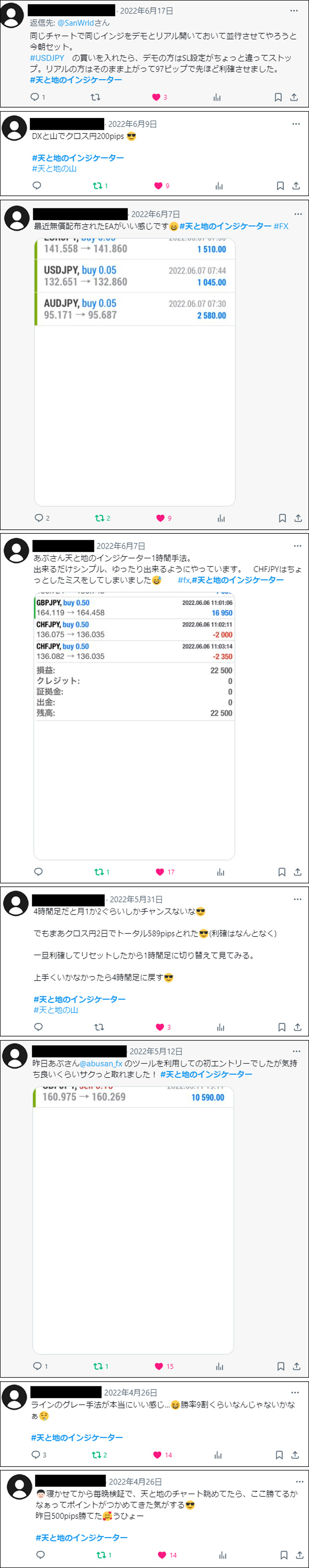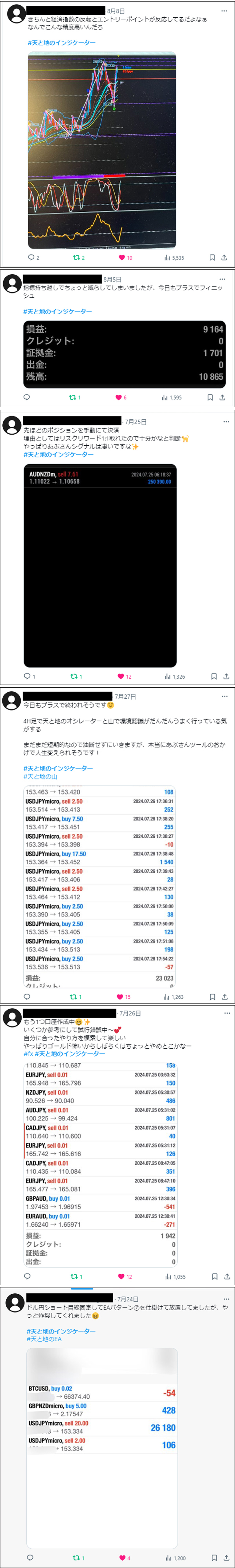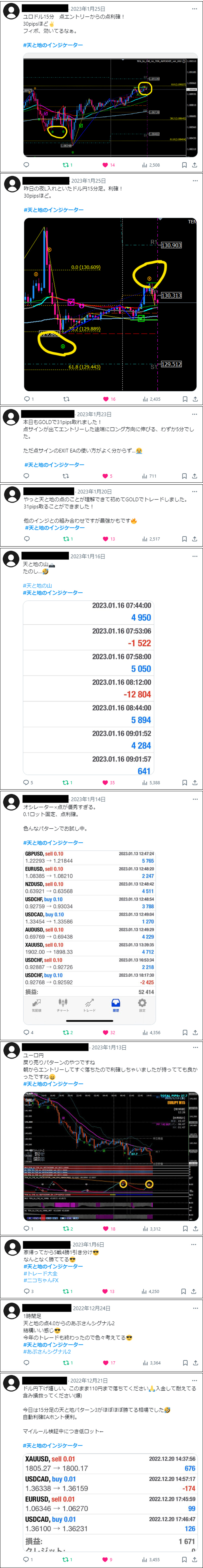*(旧Tw*****)で「#天と地のインジケーター」と検索をかけてみた結果、ユーザー様からの沢山の貴重なポストが確認できました。その中から、勝ち報告を始め、有益な内容のポストを厳選してご紹介させていただきます。きっと皆様の参考になると思います。