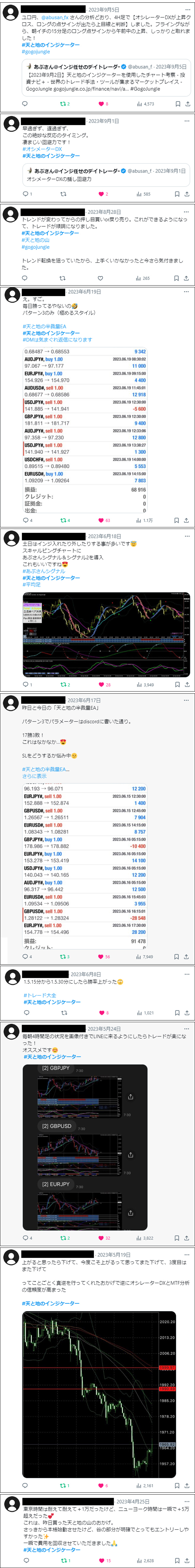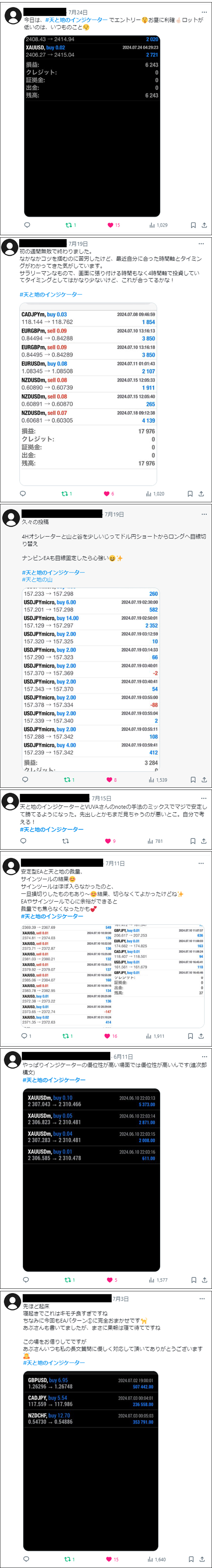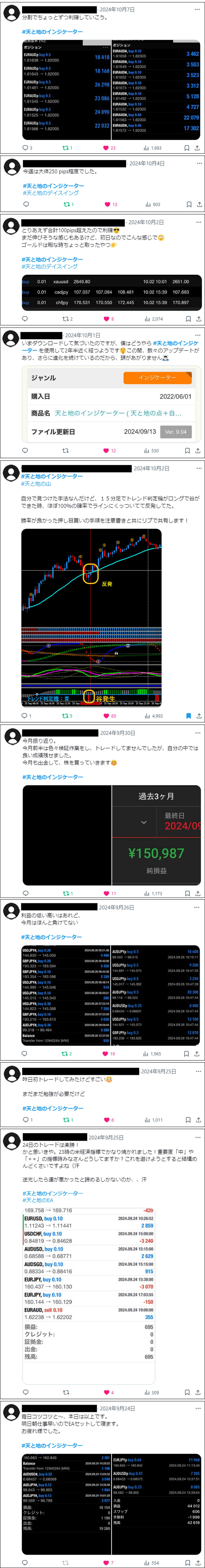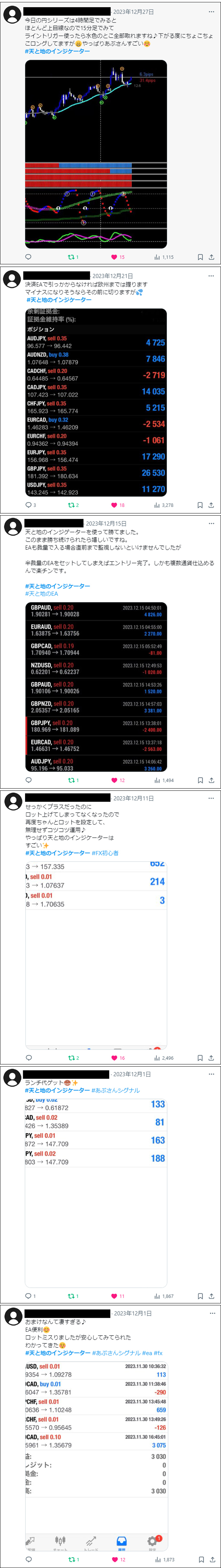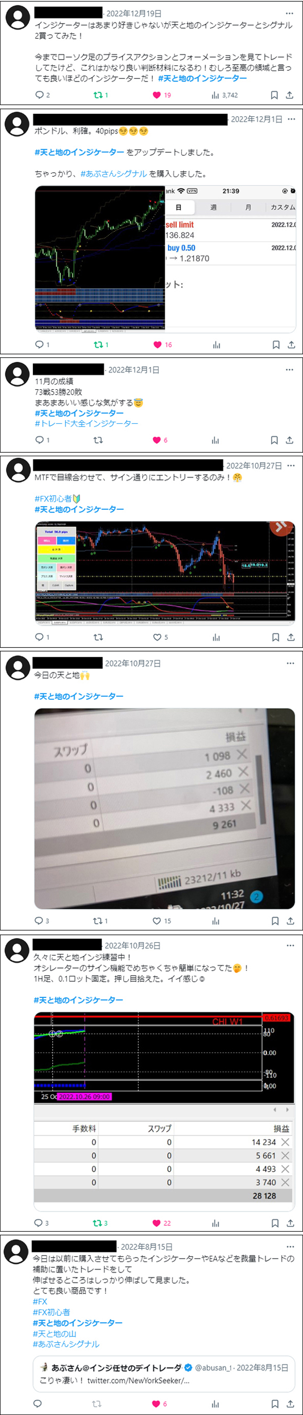 *(旧Tw*****)で「#天と地のインジケーター」と検索をかけてみた結果、ユーザー様からの沢山の貴重なポストが確認できました。その中から、勝ち報告を始め、有益な内容のポストを厳選してご紹介させていただきます。きっと皆様の参考になると思います。