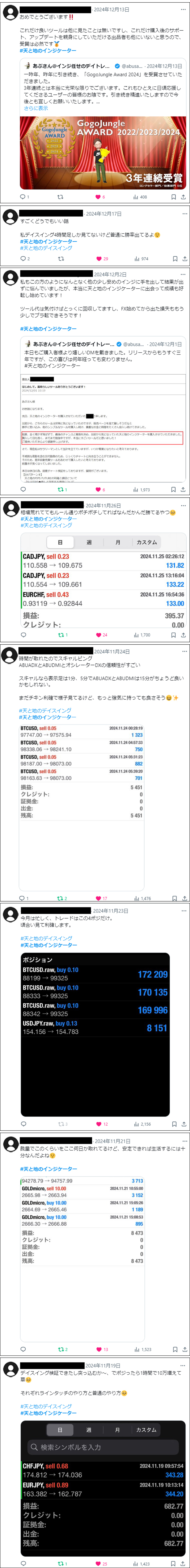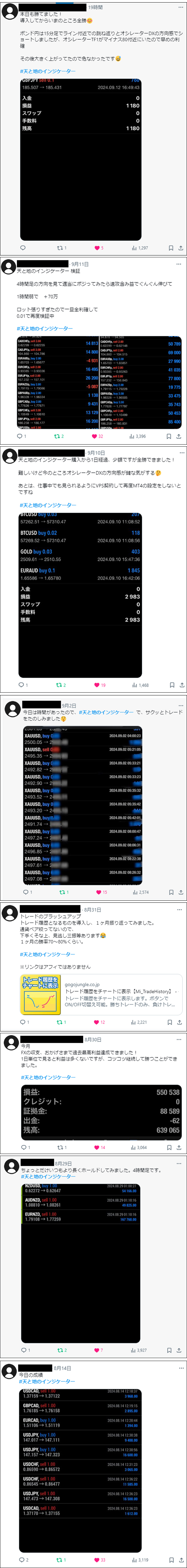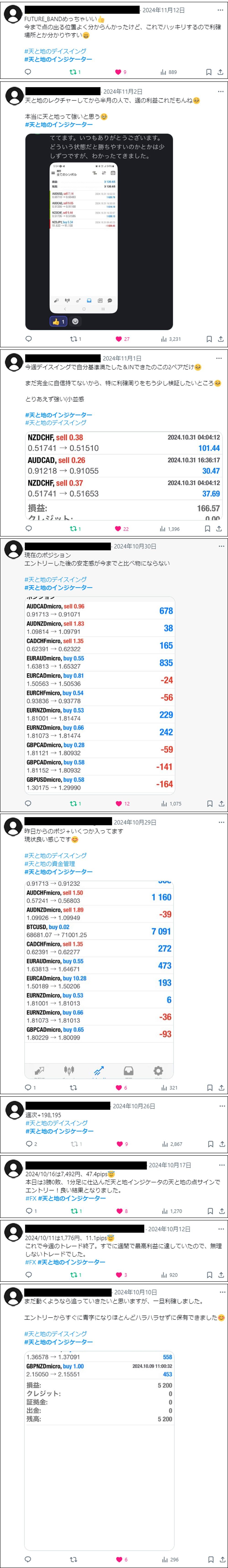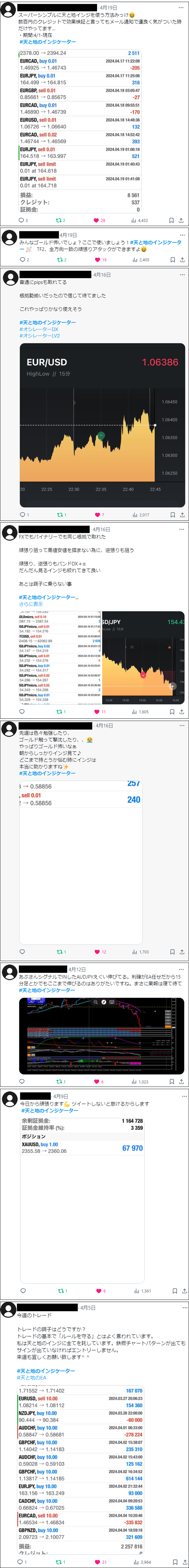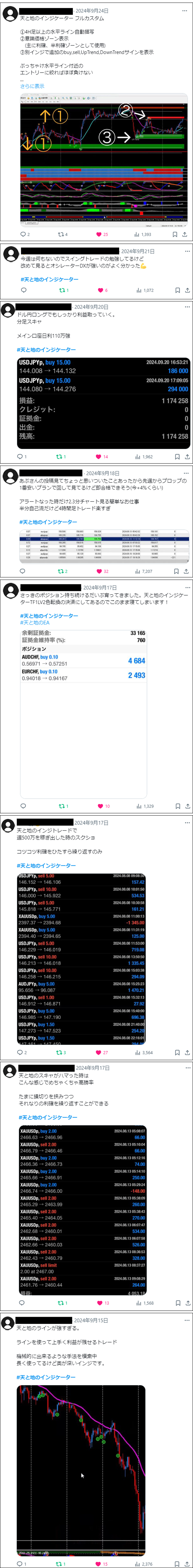 トレードで勝ち続ける秘訣は「手法を信じる事」です。この信じる気持ちが、ポジションを持ち続ける際のメンタルに大きく関わってきます。ユーザー様からのポストをこのようにご紹介する理由の一つに「本ツールのトレード手法を使って成功されている方が数えきれない程いる」という紛れもない事実を皆様にご認識していただきたいという事がございます。是非最後まで読んでいただけますと幸いです。