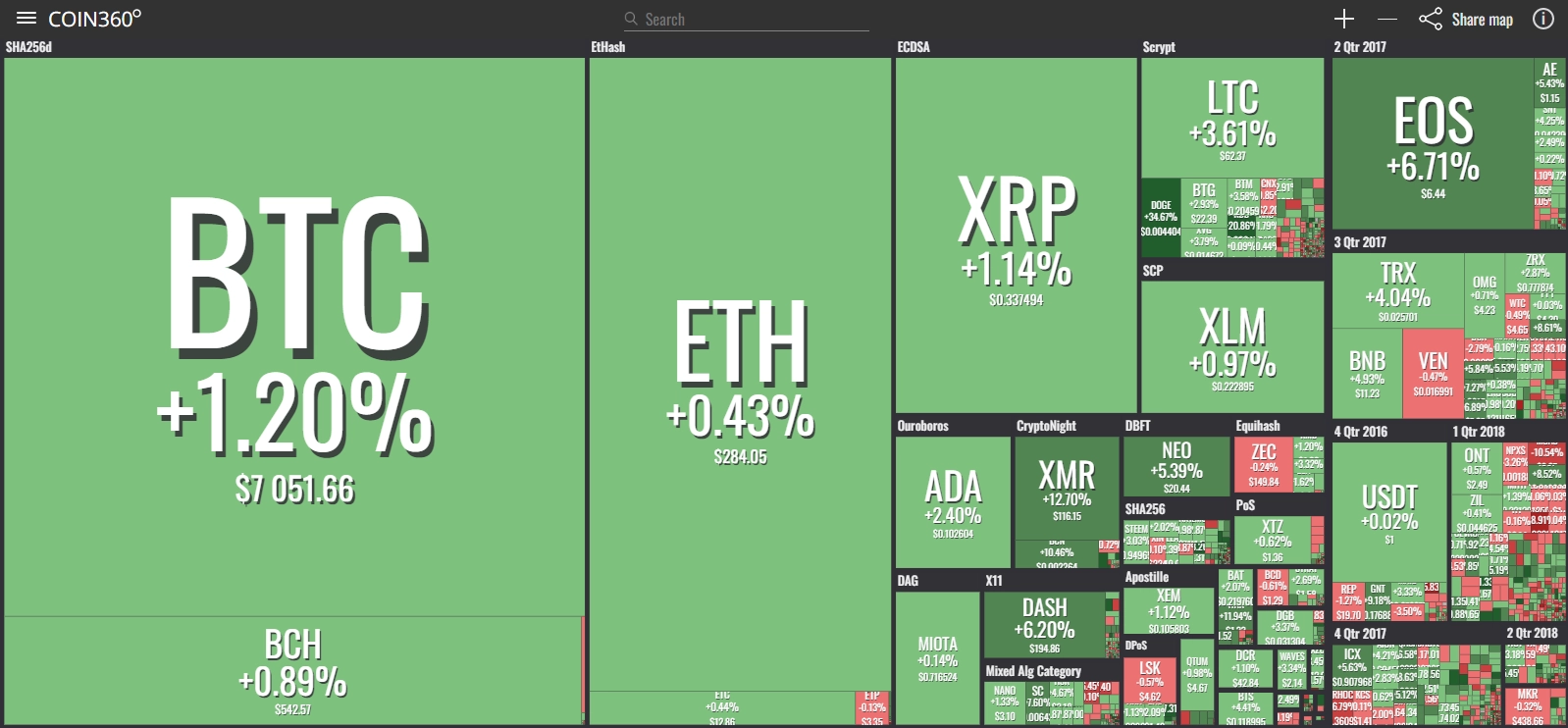 coinmarketcap(コインマーケットキャップ)のサイトから、ドミナンス(各銘柄が仮想通貨全体の時価総額に占めるパーセンテージ)を定点観測していきます。仮想通貨全般が下方向に大きく動き出している相場状況を受け、毎日更新することとし、仮想通貨業界を俯瞰および転換期を早期に発見することを目的とします。