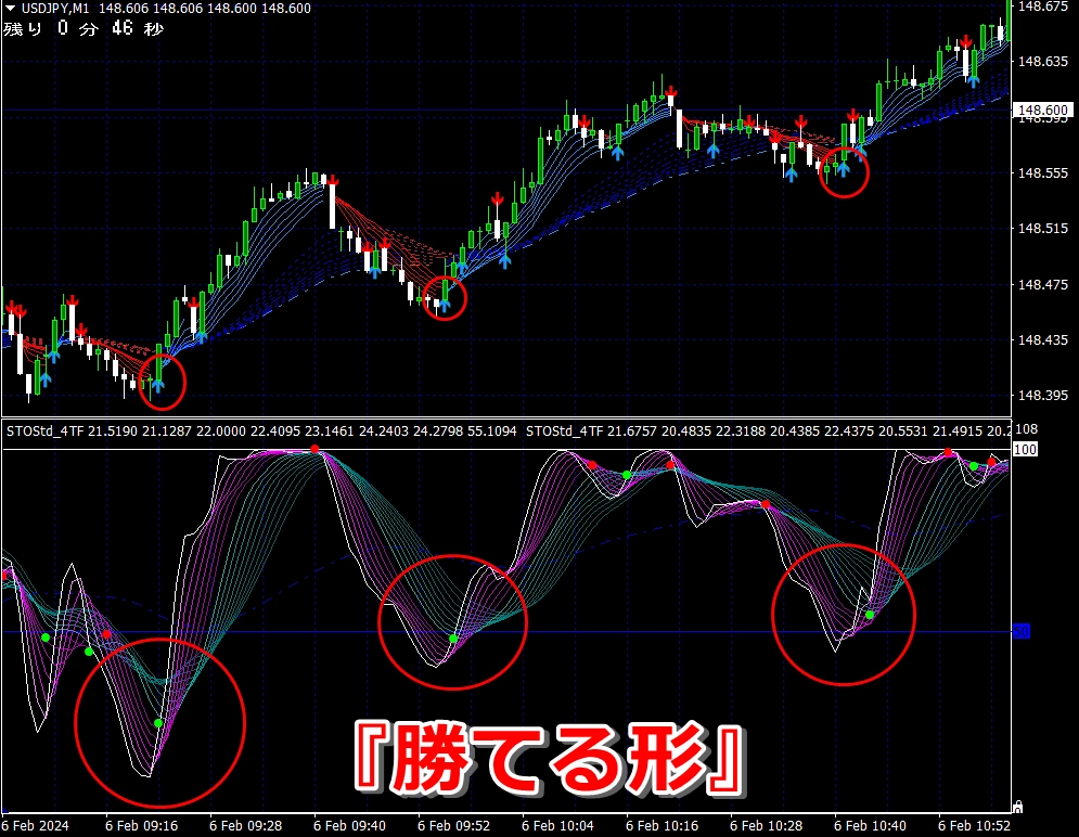 ② 矢印サイン点灯状態で、インジケーターのピンク色の帯が、緑の帯を下からすくい上げるような形状であれば、現在のローソク足が確定する数秒前か確定の直後に1分判定または3分判定でハイエントリーします。