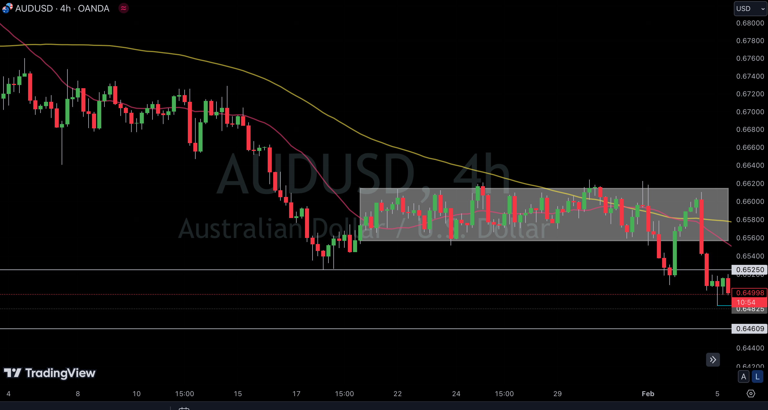 4時間足、長く続いたレンジを下抜けから前回安値割れ