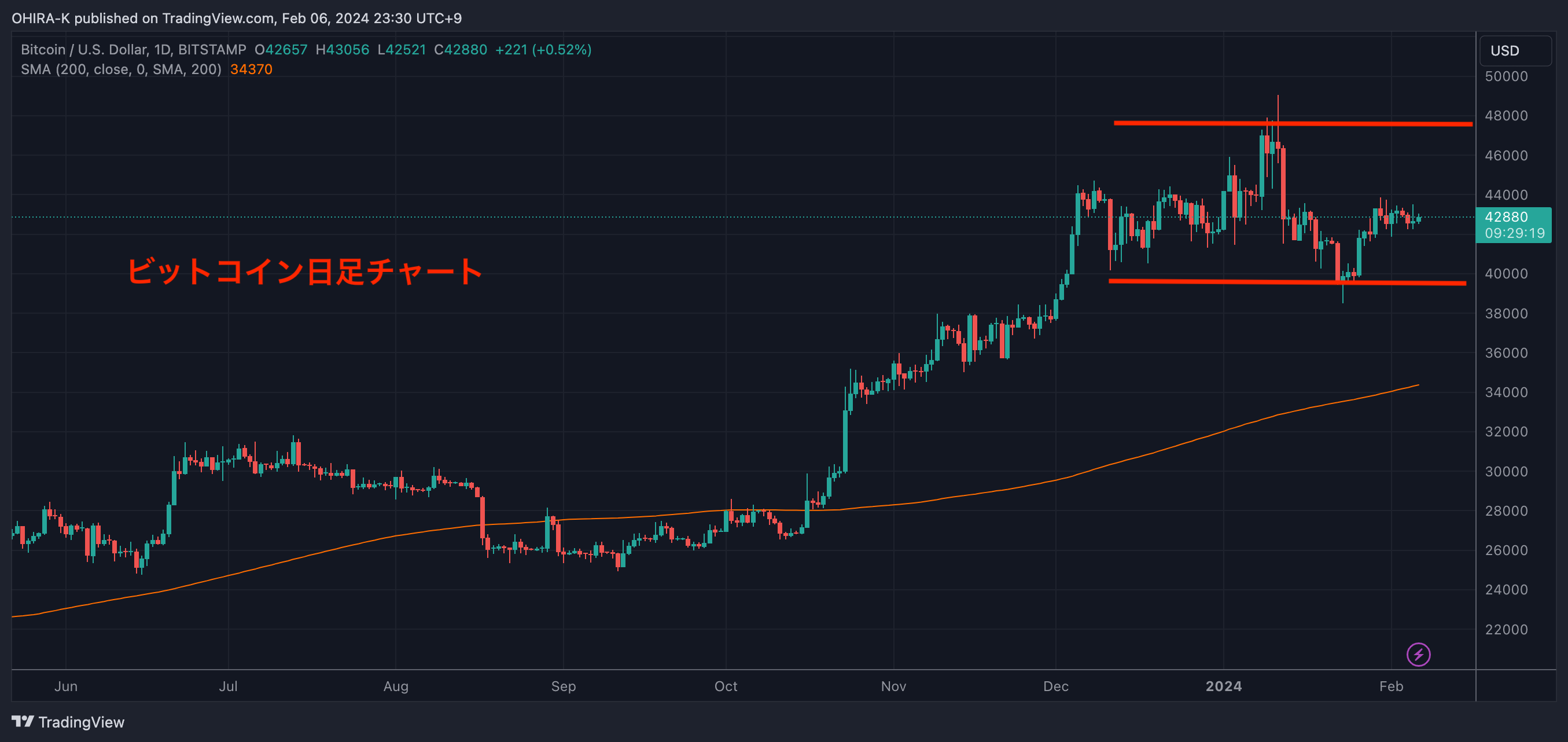 また先月承認されたビットコインETF。現在売り圧が無くなってきているということで、その後価格を戻して今の価格となっています。