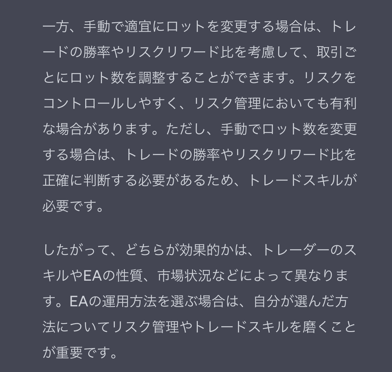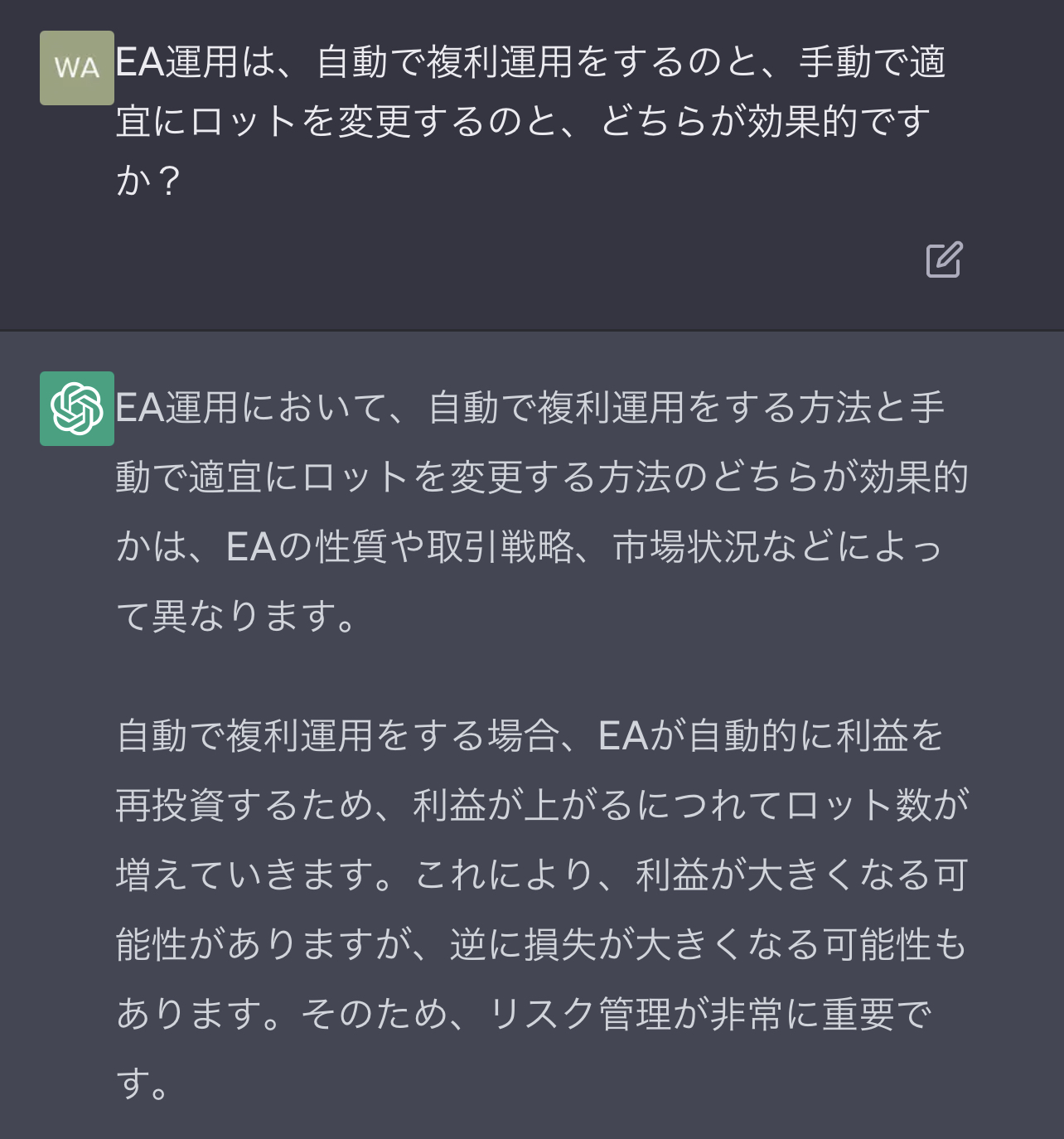 「EA運用は、自動で複利運用するのと、手動で適宜にロットを変更するのと、どちらが効果的ですか?」