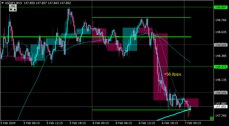 昨日は148.50付近で天井圏の形成を待ち、短期足で下げダウになったことを確認後にショート。