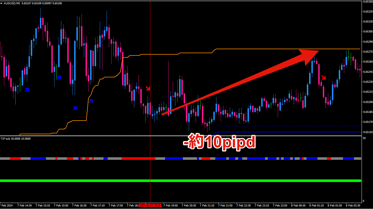 今回はおしくも利確ポイントまで数pips届かず、損切りとなりました(汗)