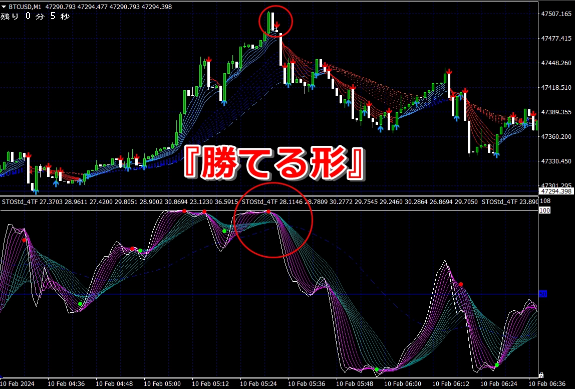 ② 矢印サイン点灯状態で、インジケーターのピンク色の帯が、緑の帯に上から覆いかぶさるような形状であれば、現在のローソク足が確定する数秒前か確定の直後に1分判定または3分判定でローエントリーします。