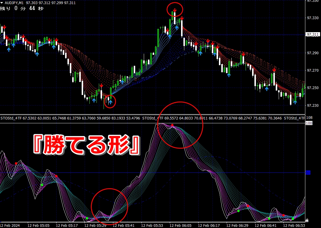 ★ サイン点灯後、ピンク帯が緑帯をすくい上げる形状で必勝エントリー!