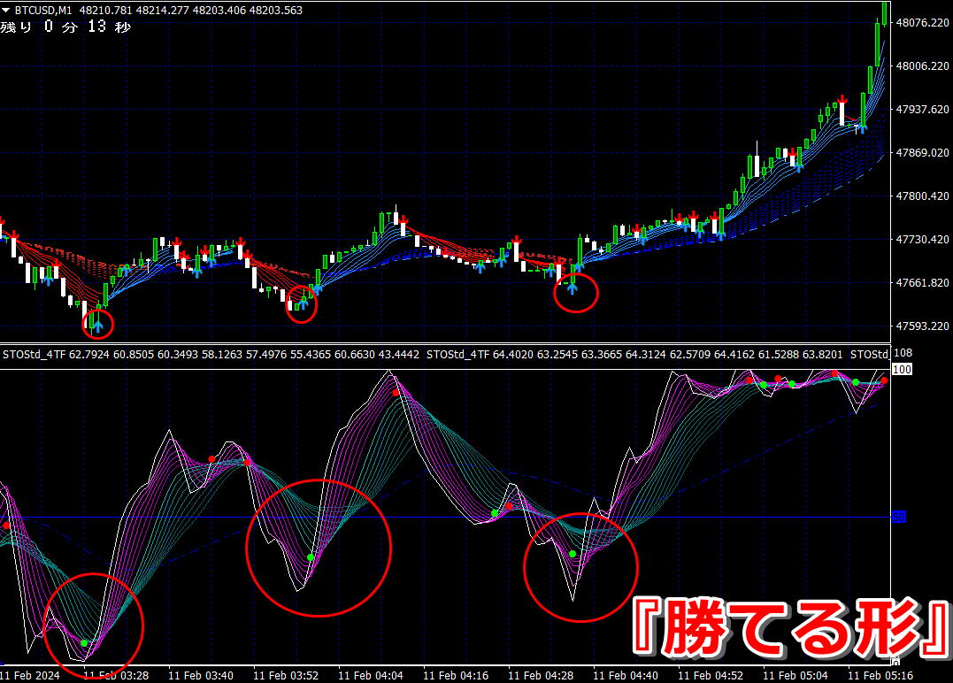 ② 矢印サイン点灯状態で、インジケーターのピンク色の帯が、緑の帯を下からすくい上げるような形状であれば、現在のローソク足が確定する数秒前か確定の直後に1分判定または3分判定でハイエントリーします。