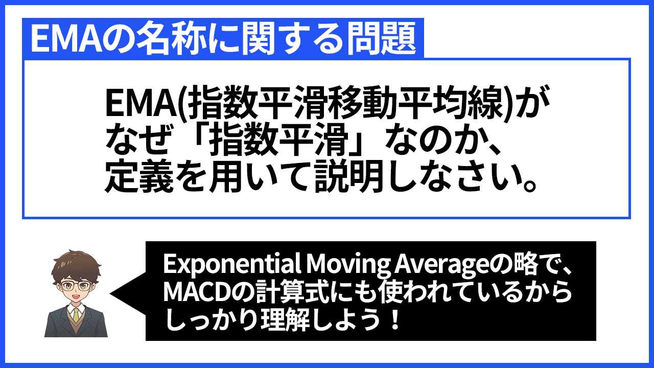 「EMA(指数平滑移動平均線)が、なぜ『指数平滑』なのか、EMAの定義から説明しなさい。」