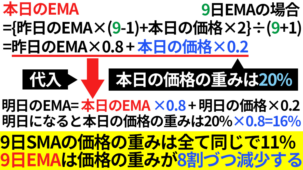 本日のEMA={昨日のEMA×(9-1)+本日の価格×2)÷(9+1)