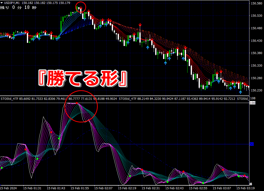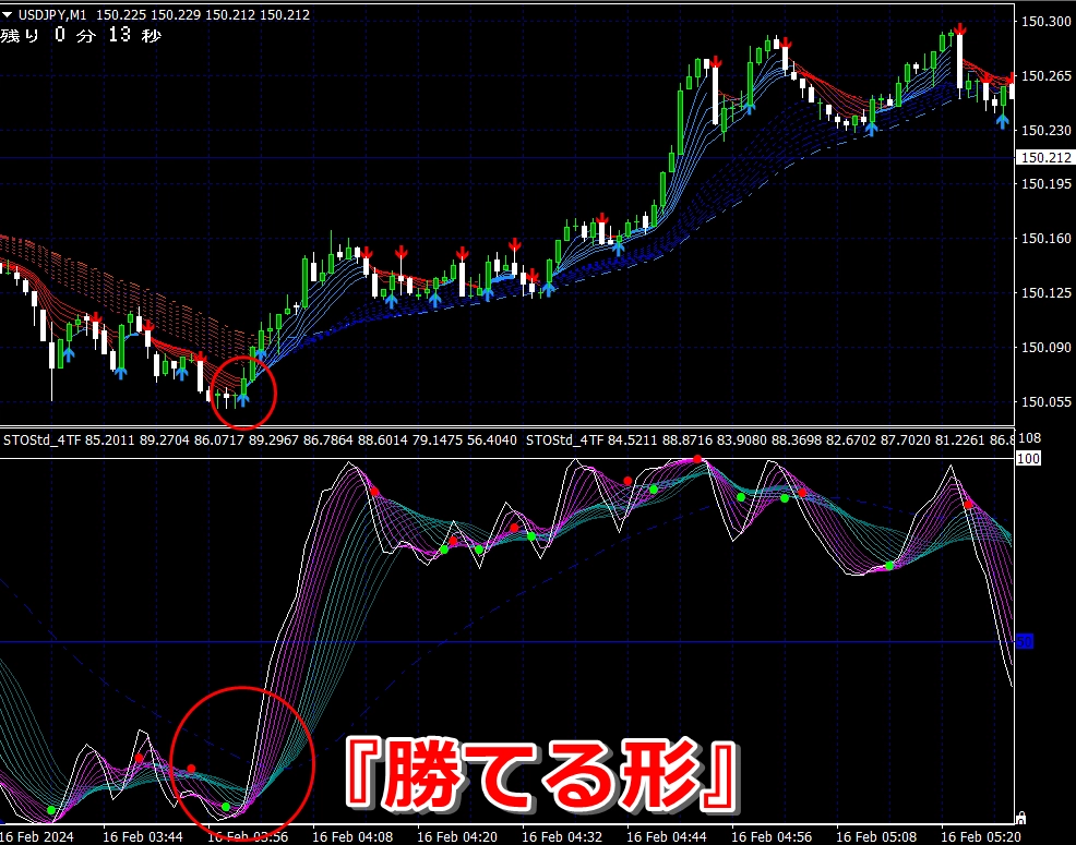 ② 矢印サイン点灯状態で、インジケーターのピンク色の帯が、緑の帯を下からすくい上げるような形状であれば、現在のローソク足が確定する数秒前か確定の直後に1分判定または3分判定でハイエントリーします。